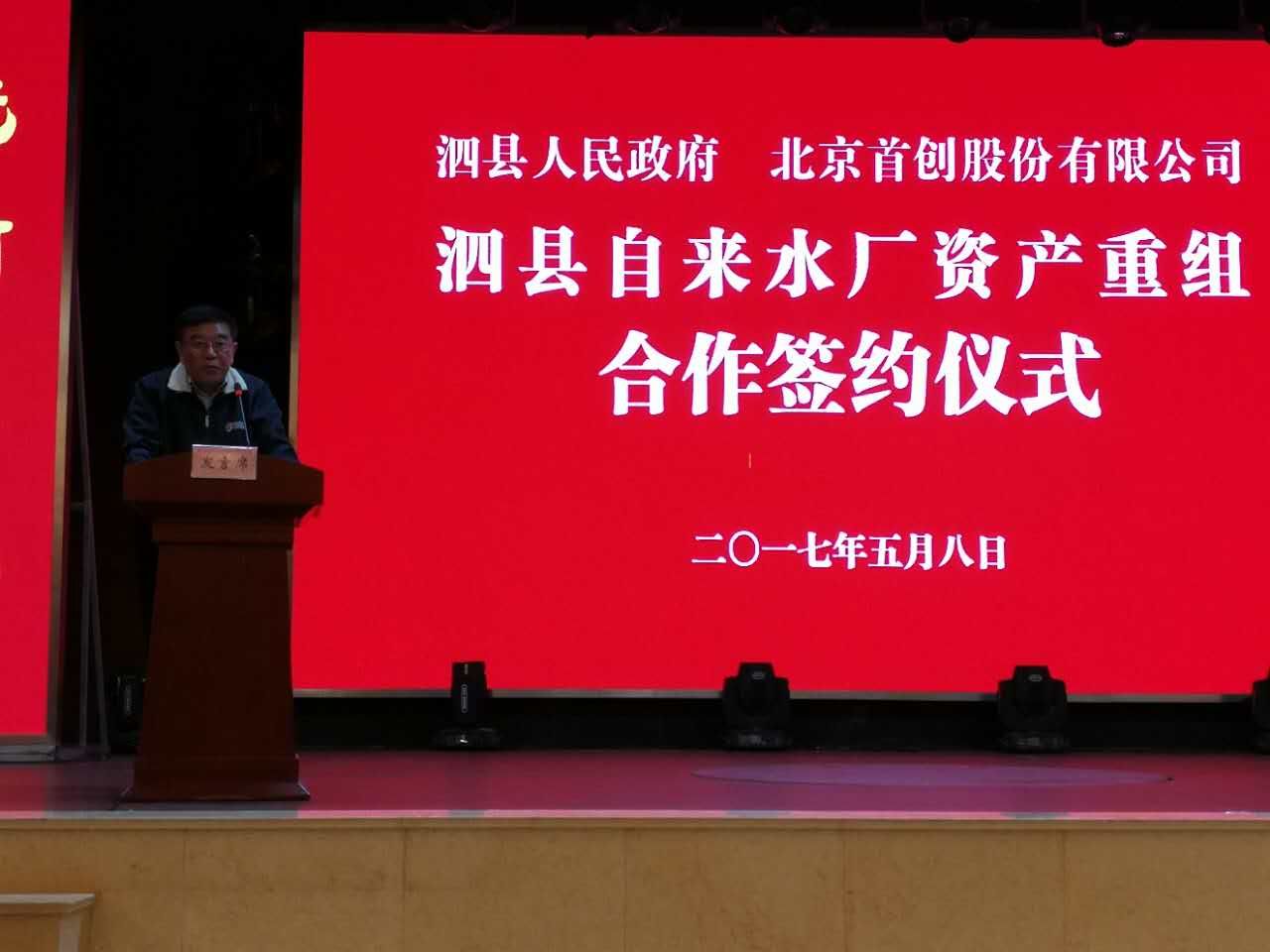 5月8日上午,首创股份与安徽省泗县人民政府关于泗县自来水厂资产转让及城市供水特许经营项目合作签约仪式在泗县举行。首创股份监事长王瑞林、执行副总经理崔宝军、泗县县委书记张志强、县长王法立、常务副县长赵明等出席签约仪式。