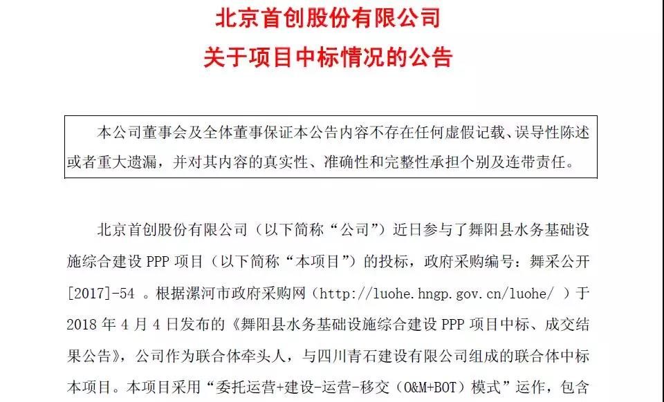 首创股份年后业务拓展再传捷报,公司于4月9日晚间在上交所发布项目中标公告显示,其与四川青石建设有限公司组成的联合体中标舞阳县水务基础设施综合建设PPP项目。舞阳县位于河南省漯河市,据了解,该项目是河南省省级PPP示范项目,既是厂网一体化的综合类水务PPP项目,也是典型的增量带动存量项目。该项目中标再次展示了首创股份在城镇供排水一体化领域卓越的综合服务能力。