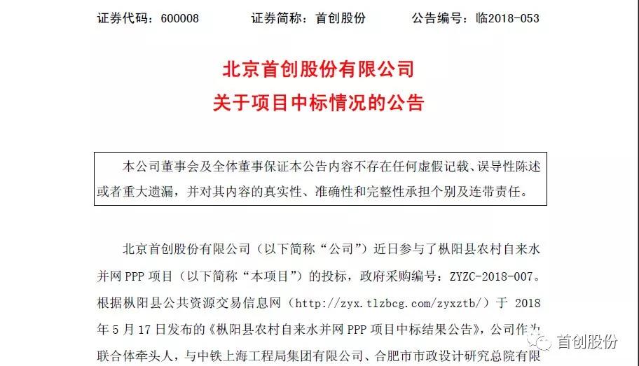 5月18日,首创股份于上交所发布项目中标公告,公司新中标安徽省铜陵市枞阳县农村自来水并网PPP项目。公告显示,公司作为联合体牵头人,与中铁上海工程局集团有限公司、合肥市市政设计研究总院有限公司联合中标该项目,项目总投资约14.15亿元。