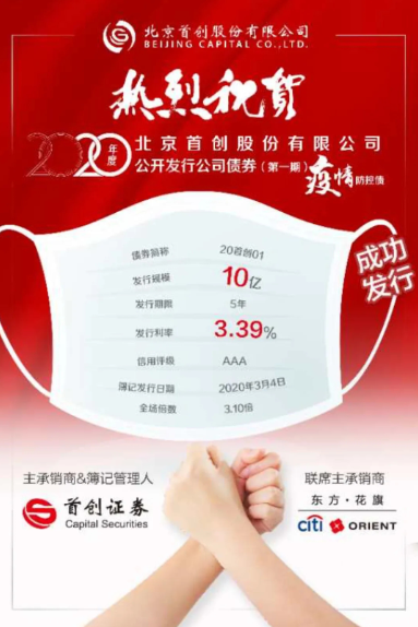 3月6日,首创股份完成疫情防控专项债券的发行工作,成功募集资金10亿元,期限为5年,票面利率3.39%,低于同期银行贷款利率136BP,认购倍数达3.10倍。