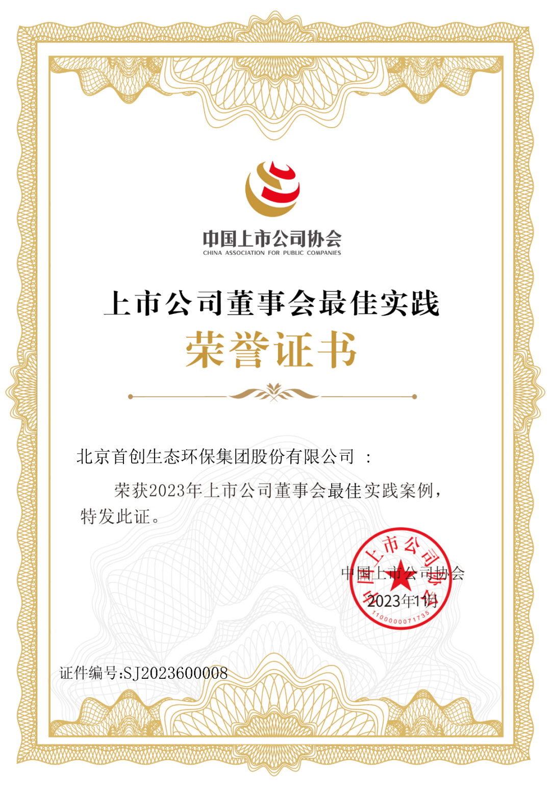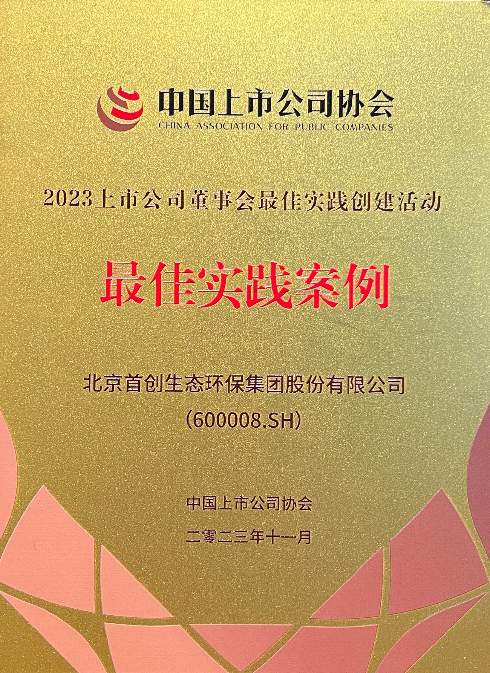 2023中国上市公司企业家年会11月11日在深圳举行。年会期间发布了《上市公司董事会履职年度报告2023》,并开展了“2023上市公司董事会最佳实践创建活动”。首创环保集团荣获最佳实践案例奖项,首次获得中国上市公司协会的权威认可,取得该级别奖项的公司占市场上市公司比例仅为1.8%。