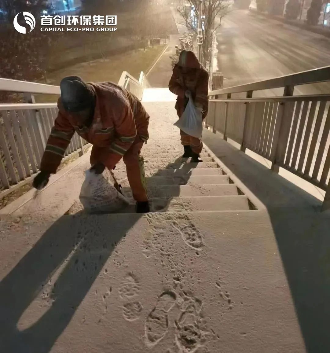 为应对暴雪来临,12月8日,首创环保在东城全体环卫人员进入24小时轮班,对全部机械设备进行调试,并增调60名一线清扫人员,以保障全天候作业人员充足。此外,首创环保还采取了一系列有针对性的措施:对东四北大街、金宝街、故宫角楼等人流密集区域增加工作人员,并增配融雪剂抛洒机、雪滚、吹雪机等设备;对于医院、学校等重要场所门口,安排专班进行实时清扫,保障路面无积雪。