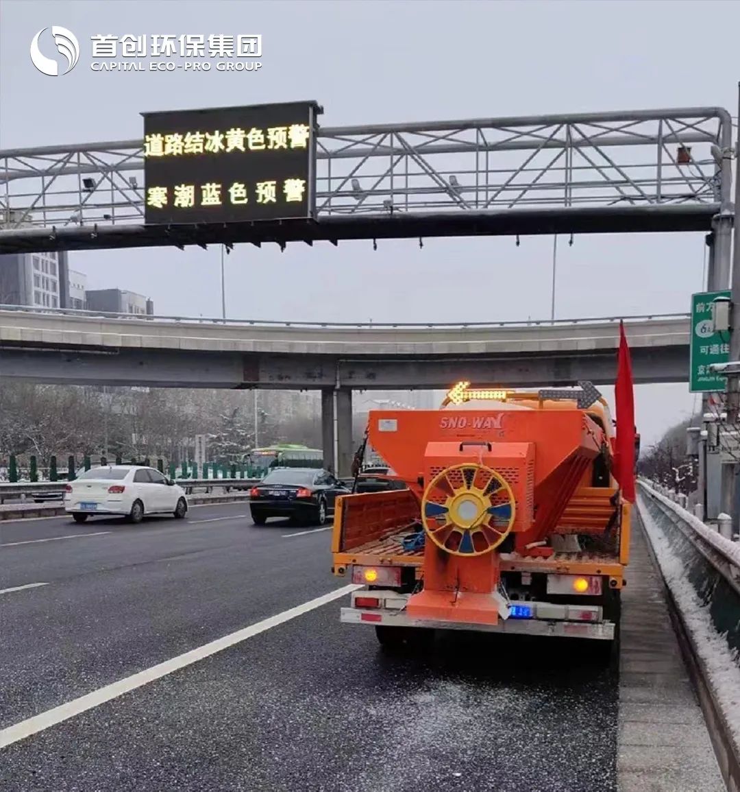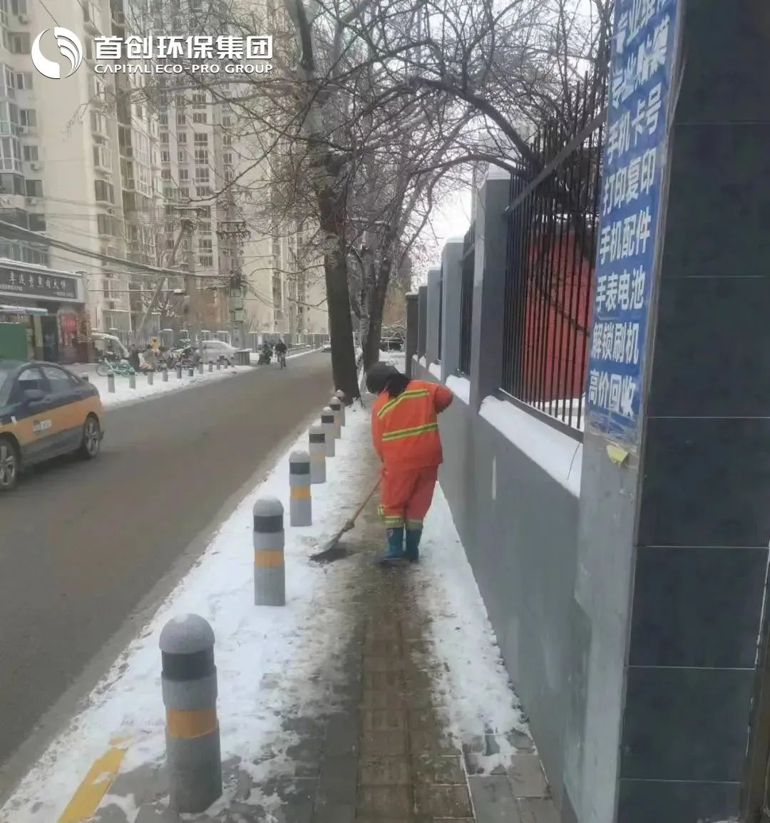 暴雪来临后,首创环保集中力量,优先将学校、医院等重点场所门前人行道上清理出一条宽度不小于0.8米的通道,以确保行人安全;对于交通主干道,则利用大型机械化设备喷撒盐水消除积雪;重点区域班组配发手推式滚雪机、吹雪机等设备,清扫效率极大提高。
