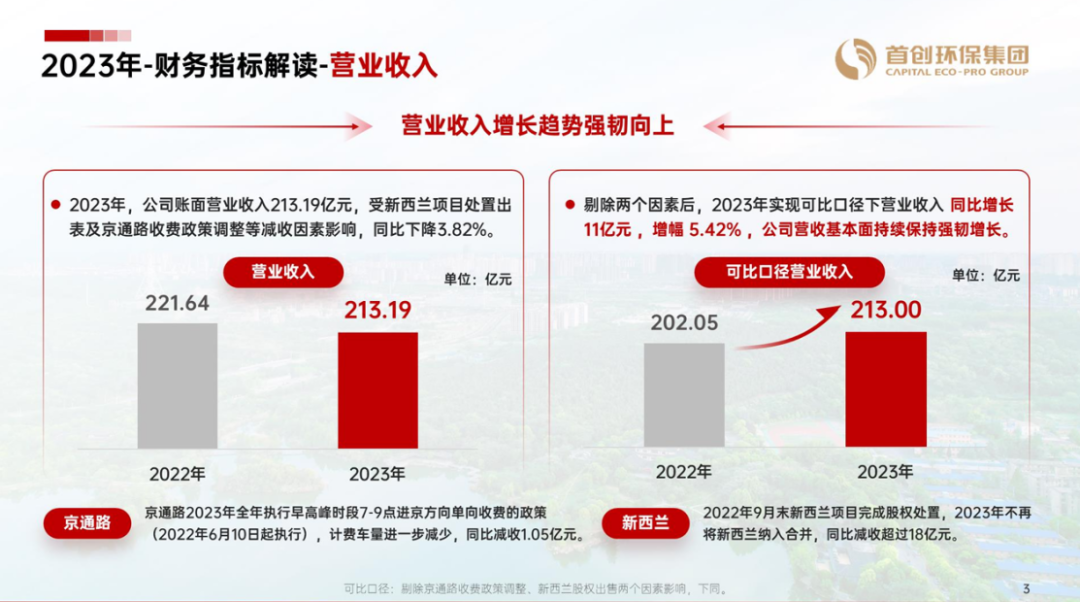 2023年,首创环保可比口径营业收入213亿元,同比增长5.42%;实现扣非归母净利润15.48亿元,同比增长44.83%。经营现金流量34.22亿元,增长3.99亿元,增幅13.20%。同时,公司水、固核心业务毛利持续提升,管理费用占收入比重、财务融资成本等关键财务指标持续调优。