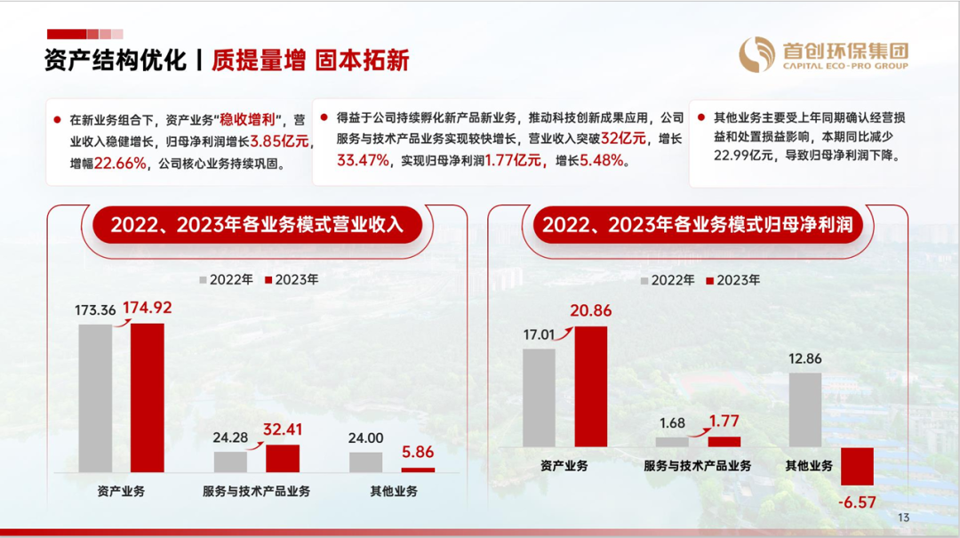 2023年,首创环保资产类业务的营业收入174.92亿元,同比增长0.90%,归母净利润20.86亿元,同比增长22.66%。服务类业务和技术产品类业务营业收入占营业收入比重为15.20%,较上年同期提升4.25个百分点;在2023年128亿元的新增合同额中,服务类业务91.69亿元,占总新增合同额71.29%。
