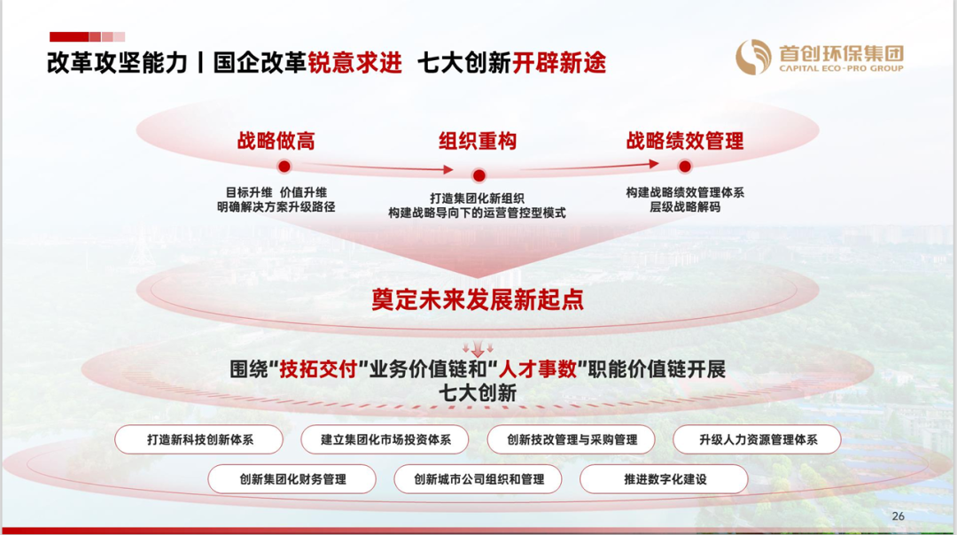 公司围绕业务价值链和职能价值链,推动打造新科技创新体系、建立集团化市场投资体系、创新技改管理与采购管理、升级宝威体育(中国)官方网站管理体系、创新集团化财务管理和城市公司组织管理、推进数字化建设七大创新。2023年,首创环保入围国务院国资委“双百企业”,下属科技型企业北京首创环境科技有限公司与北京首创大气环境科技股份有限公司双双入围“科改示范企业”,公司在改革创新方面的成果得到充分认可。