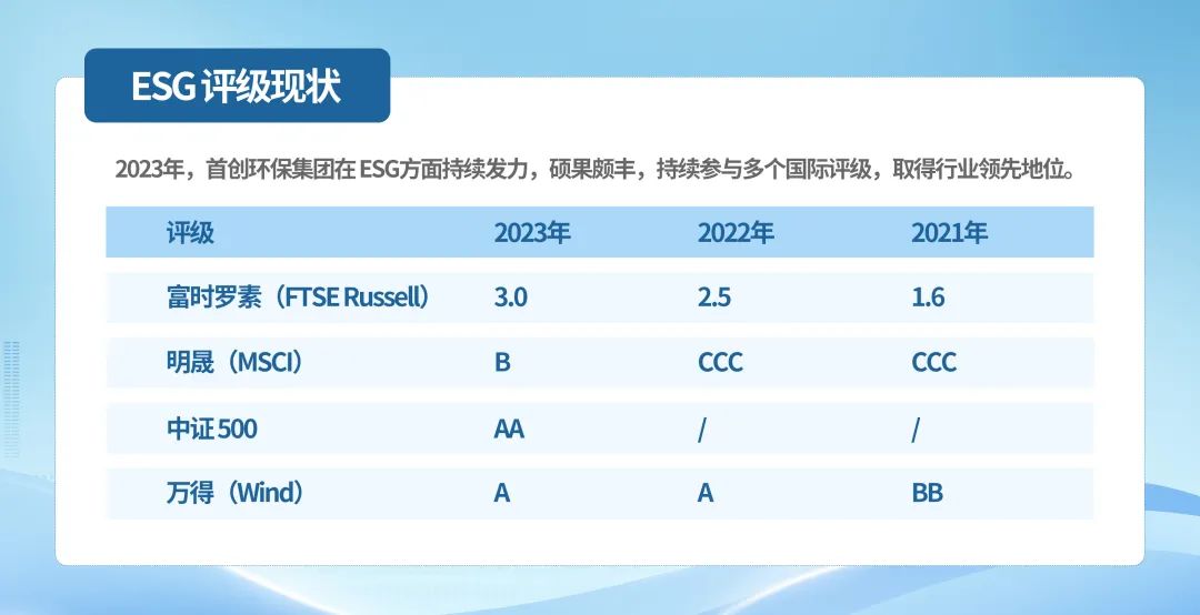 首创环保集团在ESG方面的实践,获得了监管机构和资本市场的认可,先后入选北京市国资委指导的《北京市属国有控股上市公司环境、社会及治理(ESG)蓝皮书》“治理篇”优秀案例、“环境篇”优秀案例,中国上市公司协会“上市公司ESG最佳实践案例”、“上市公司ESG优秀实践案例”,国务院国资委发布的《国资国企社会责任蓝皮书(2023)》国有企业ESG先锋100指数。