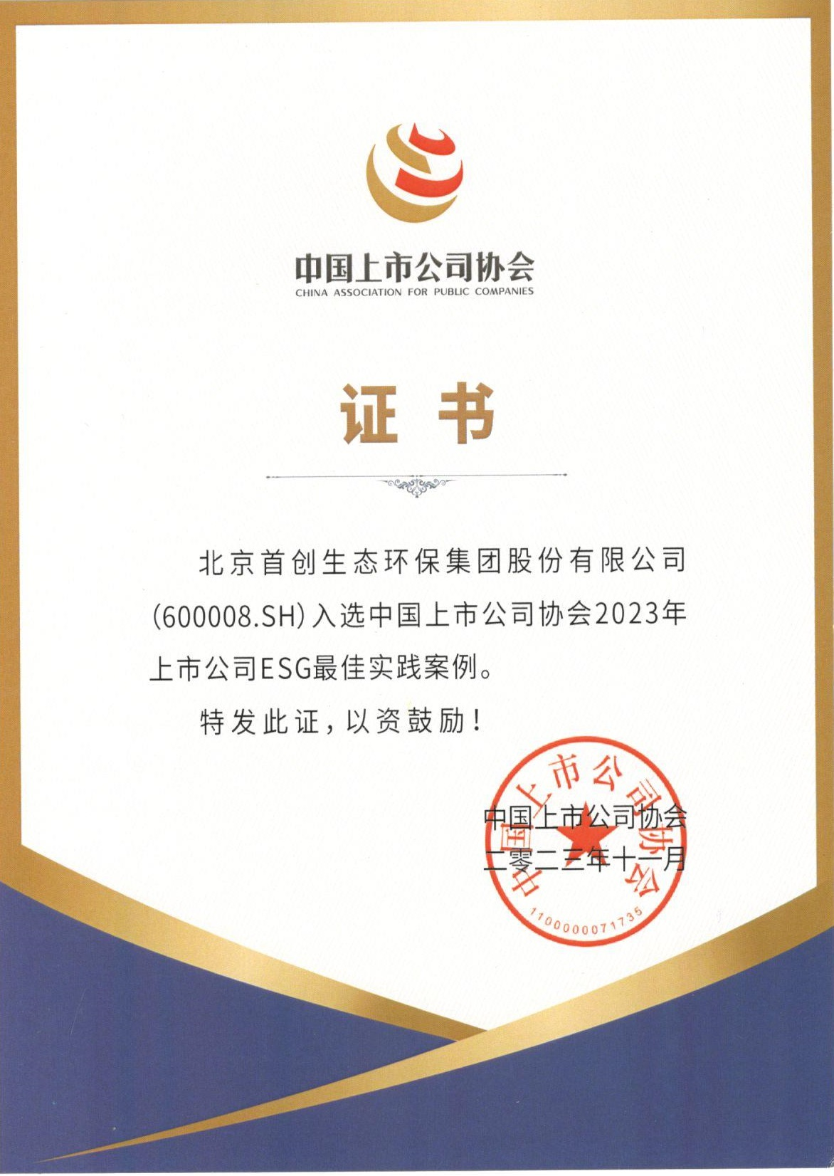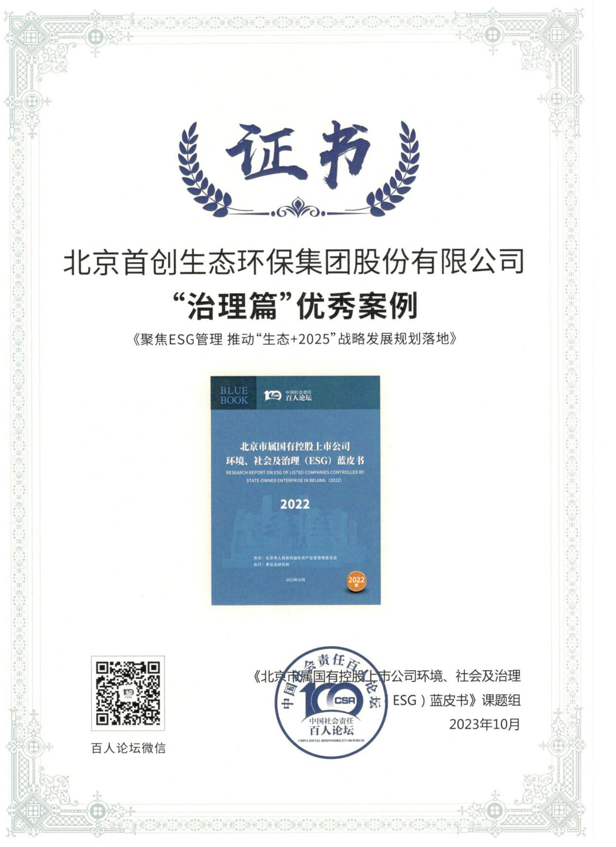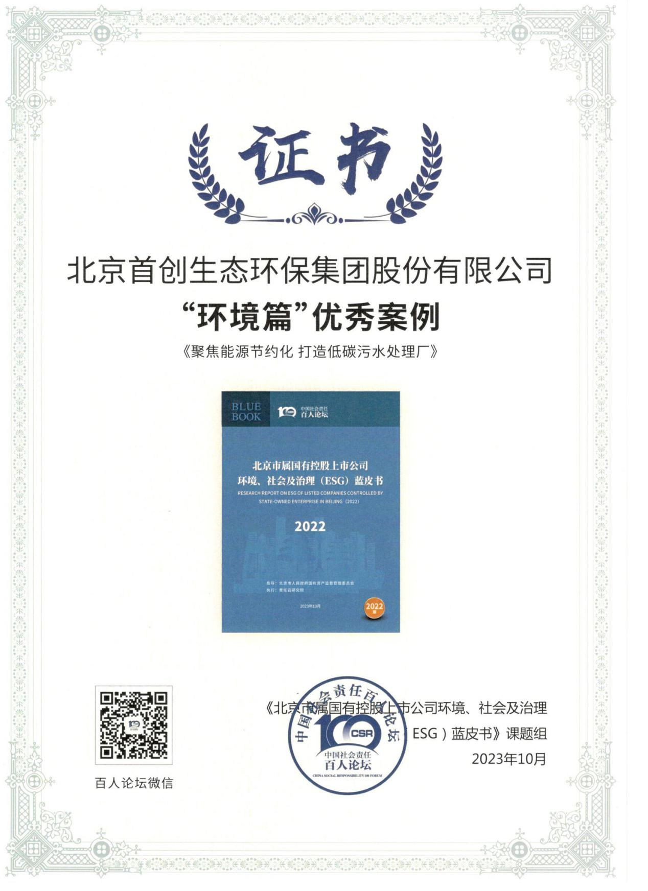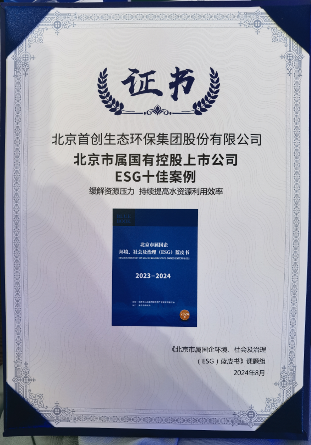 在8月29日举行的“ESG中国•京津冀国有企业社会责任发布会”上,首创环保集团再获认可,凭借绿色低碳发展实践及可持续发展治理能力持续提升获评北京市属国有控股上市公司ESG十佳案例。
