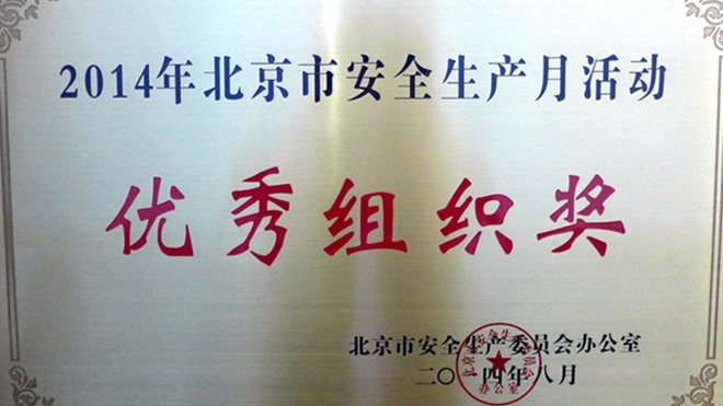 经首创集团推荐,公司在北京市安全生产委员会组织的"安全生产月"活动中,被授予“2014年北京市安全生产月活动优秀组织奖”。