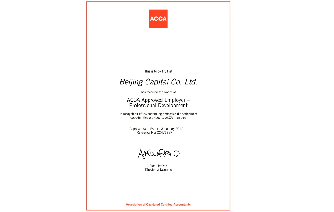 2015年1月,公司成功取得英国ACCA(特许公认会计师公会)专业发展类雇主认证。ACCA认证雇主计划旨在与雇主共同推进培训计划,并通过全球化的标准,为雇主提供培训支持和指导,有效提高雇主企业财务从业人员的专业素质。目前,ACCA已与全球网上授课和培训机构,例如BPP﹑Mentor-uk.com﹑Servecast和Thomson Netg结成战略联合,将更好的满足雇主对信息和培训的需求。